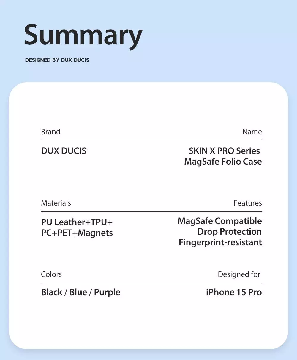 Міцні матеріали та довговічна конструкція чохла Dux Ducis Skin X Pro MagSafe на iPhone 15 Pro гарантують, що він не тільки прослужить довго, але й надійно захистить ваш гаджет. Внутрішній бампер відповідає розмірам пристрою, забезпечуючи надійне кріплення.